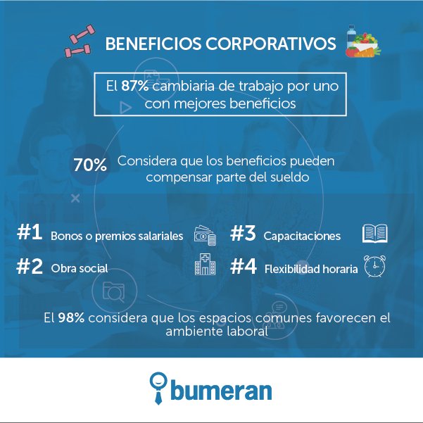 A la hora de buscar empleo, el 70% de los encuestados manifestó que prioriza los beneficios frente a la remuneración que le pueda ofrecer la empresa. Sin embargo, entre los beneficios más valorados se encuentran los de índole económica (75%), como bonos o premios por rendimiento. Con muy poca diferencia lo siguen los de cobertura médica (70%), capacitaciones (65%); flexibilidad horaria o días de vacaciones extra (65%); y calidad de vida (36%), como descuentos en gimnasios, yoga o snacks saludables.
