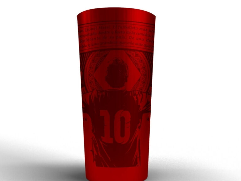 De aluminio anodizado en su cara interna y transparente en el exterior, el vaso muestra la imagen de Leo con los brazos al cielo y el 10 en la espalda. Tiene los colores característicos de Budweiser, rojo y azul, pintado con pintura orgánica libre de metales pesados e impreso en serigrafía, lo que lo convierte en una pieza única, de colección.