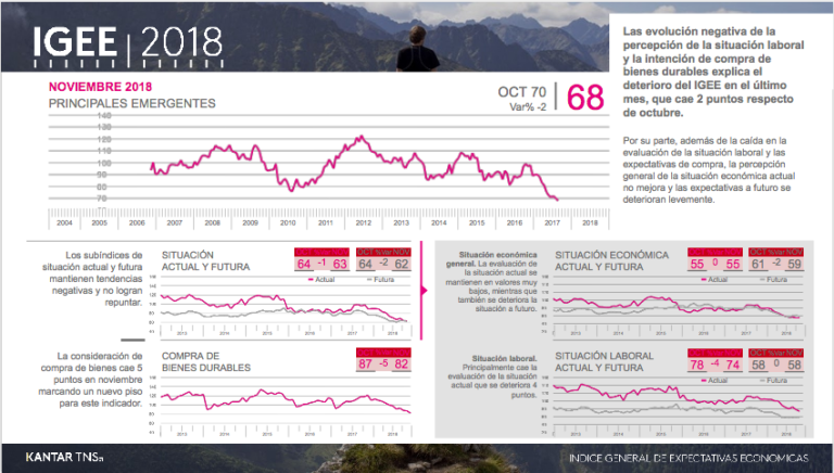 “Por segundo mes consecutivo caen las expectativas económicas, y nuevamente la variable empleo es uno de los indicadores clave para explicar este deterioro”, comentó Julieta Dejean, directora comercial de Kantar TNS. Agregó: “La situación de empleo se potencia con la percepción de que éste no es un buen momento para la compra de bienes durables”.