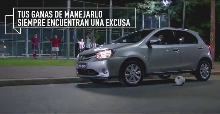 Ficha técnica. Anunciante: Toyota. Producto: Toyota Etios 2016. Título: Excusas. Agencia: Dentsu Argentina. COO Dentsu: Fabián Basteguieta. Directores creativos: Tomás Campos, Francisco González. Director de Arte: Guillermo Basile. Redactor: Santiago Tielens. Director de Cuentas: Alberto Noe. Supervisor de Cuentas: Nicolás Tosi. Ejecutiva de Cuentas: Sofía Pumarega. Asistente de Cuentas: Tania Silva. Producción agencia: Pedro Van. Responsable por el cliente: Juan Pablo Grano, Juan José Navarro, María Florencia Collavino. Productora: Rebolución. Director: Javier Usandivaras. Producción ejecutiva: Patricio Álvarez Casado, Ezequiel Ortiz. Productor: Axel Linari. Postproducción: Mym. Sonido: Portaestudio. Banda musical: Supercharango.