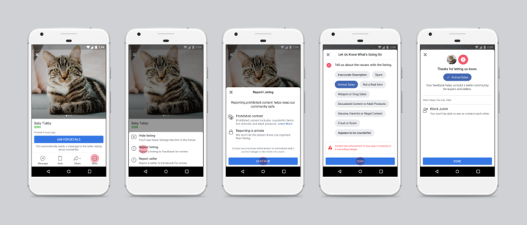 Las mejoras en seguridad y confiabilidad incluyen la detección y eliminación de contenido inapropiado (la eliminación de productos que infringen las políticas de Facebook), analizando las imágenes, contenido y contexto; las calificaciones de compradores y vendedores para promover un buen comportamiento y herramientas más robustas para reportar contenido que no pertenece a Marketplace. Si hay un artículo en venta que infringe las Políticas de comercio, se puede reportar del listado directamente en la aplicación. También se puede reportar a compradores y vendedores si tienen actividad que va en contra de las Normas Comunitarias de Facebook.