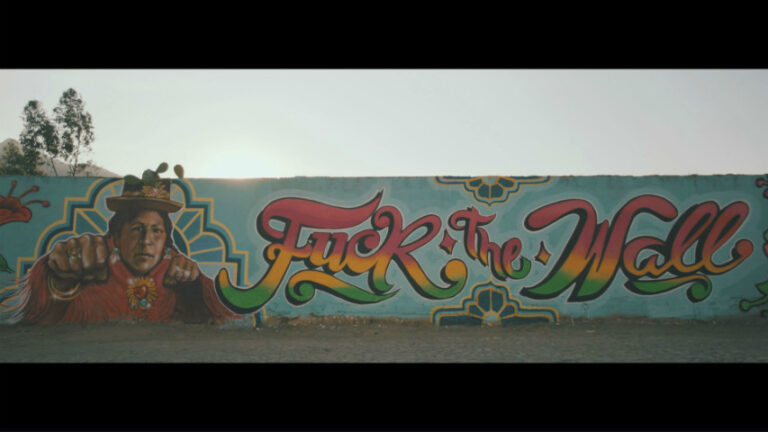 Filmado en La Paz, mientras la Cholita pronuncia sus palabras, se puede ver a un grupo de jóvenes trabajando sobre un mural en el que al final se lee un graffiti con un concreto mensaje: “Fuck the Wall”.