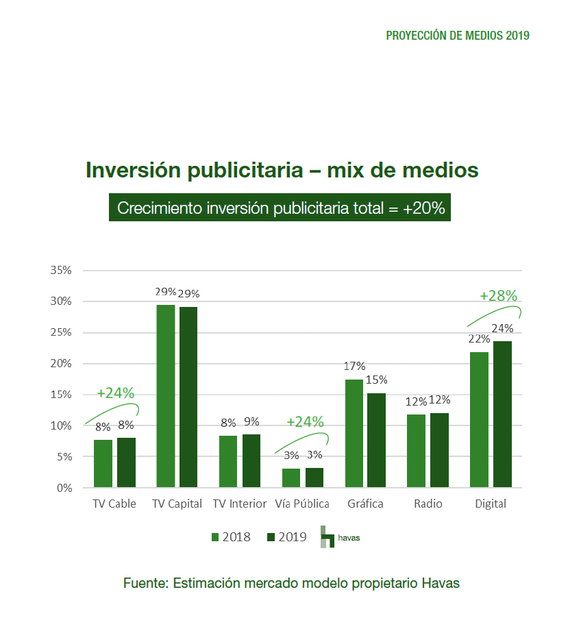 De acuerdo a las previsiones que la compañía realiza cada año, en 2019 el crecimiento de la inversión publicitaria en Argentina aumentará 20% respecto a 2018, por lo que no alcanzará a la inflación prevista para las tarifas de medios del +31%. La proyección respecto a la inversión en medios digitales crece al 28%, a raíz de una mayor democratización en los soportes tecnológicos.