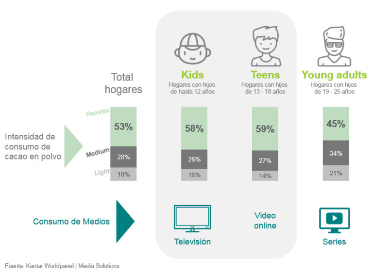 Al analizar los hábitos de consumo de una categoría en particular, como cacao en polvo, se observa que el grupo más importante en términos de volumen está compuesto por hogares con hijos de hasta 12 años, donde se destaca el consumo de televisión. Sin embargo, aquellos con hijos teens también son consumidores importantes de cacao en polvo, pero presentan distintos hábitos de medios.