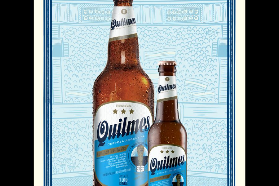 Por su parte, el porrón 340 cc descartable y la botella de 1 litro tienen una etiqueta de Quilmes Clásica a la que se le suman las tres estrellas en referencia a los tres mundiales ganados por Argentina: 1978, 1986 y el último, 2022, y un lema sobre las coincidencias y el equipo.