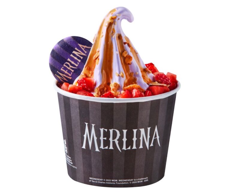 Además del helado de yogurt natural, ya está a la venta una exquisita galleta con la imagen de Merlina, que puede transformarse en un sándwich helado. Y para completar la experiencia, el macarrón sabor grosella negra transportará a los consumidores a los jardines de Nevermore y dará al helado un delicioso y oscuro toque.
