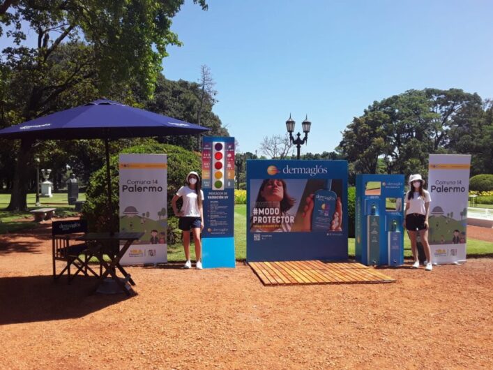En cada locación se colocó también un porta tester de pie para que las personas puedan aplicarse protector solar evitando contacto manual y de este modo cumplir con los protocolos de seguridad e higiene.